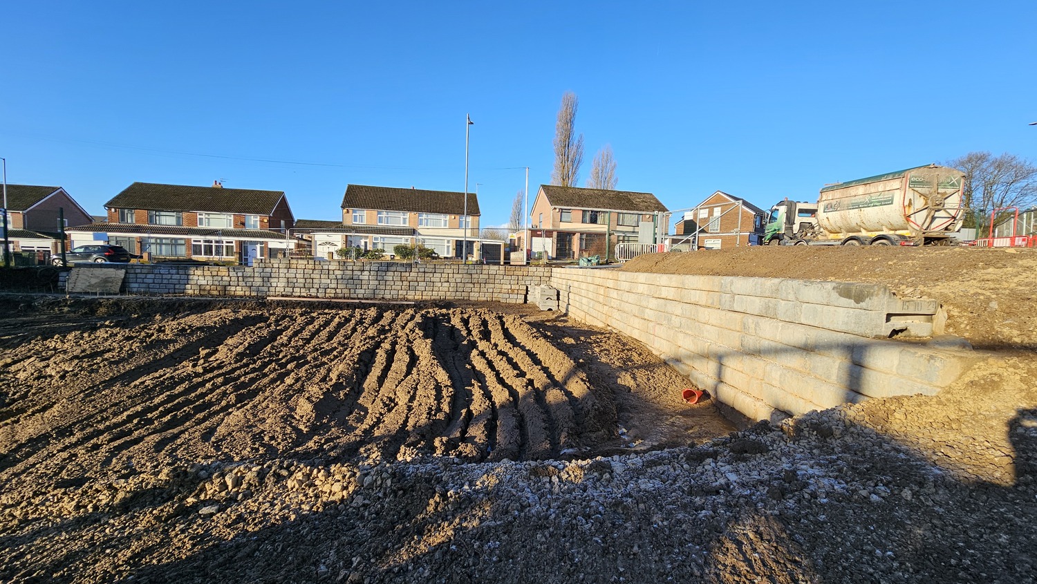 Redi-Rock was chosen for the Orchards upper site to avoid delays from typical poured concrete and brick retaining walls, easing programme delivery.
